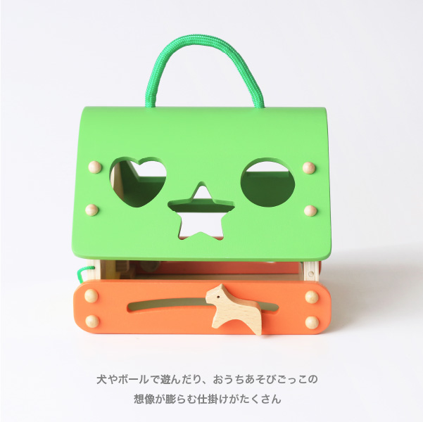 鍵を回してドアを開けたり、犬やボールで遊んだり、おうちあそびごっこの想像が膨らむ仕掛けがたくさんあります。