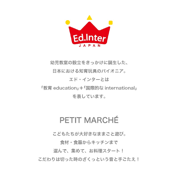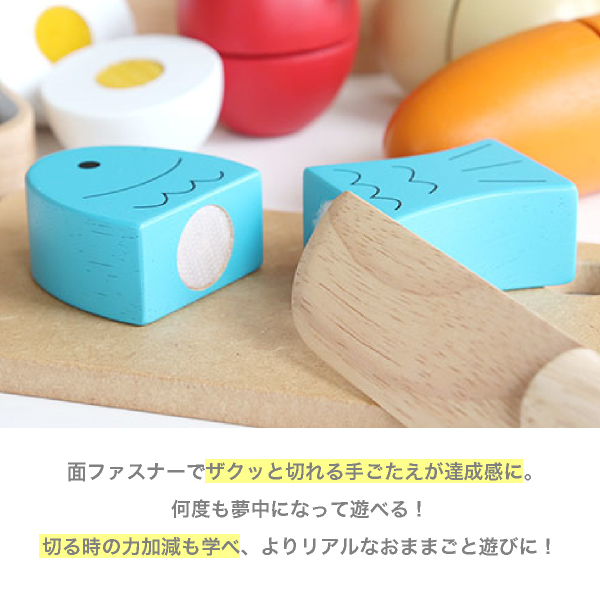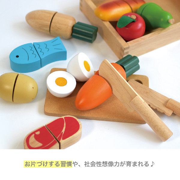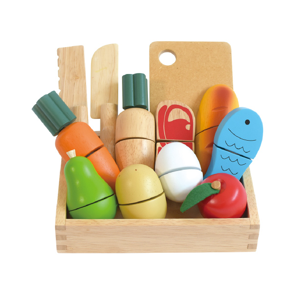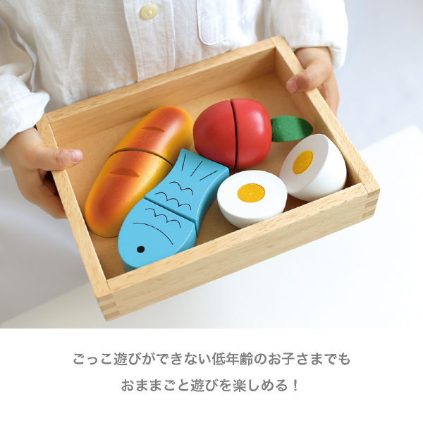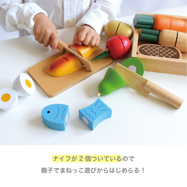 大きめサイズの食材と、2本のナイフで低年齢のお子様でも遊びやすく、はじめてのおままごとにぴったり!