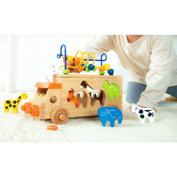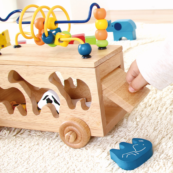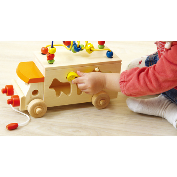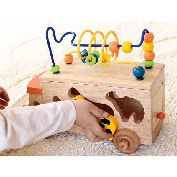動物のかたはめパズルとビーズあそびができるよくばりプルトーイ。バスにはヤギ、キリン、カメ、イヌ、ウシ、ゾウの6匹の動物のシルエットがあり、形を認識しながらブロックをはめていきます。また、バスの上にビーズコースターをのせて、ビーズをクルクルと動かしたり、手先の器用性と集中力を養います。
