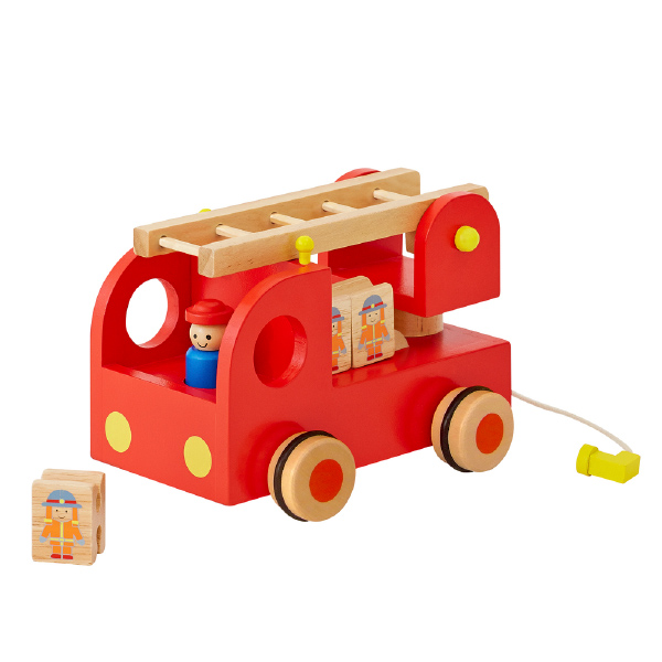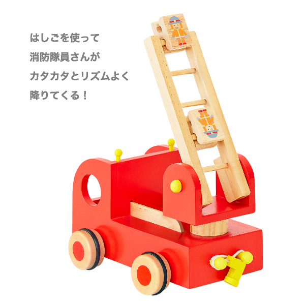 4人の消防隊員さんをのせたはしご車。はしごを斜めに上げて、消防隊員さんをはしごの上に引っ掛けると、カタカタと回転しながら降りていきます。