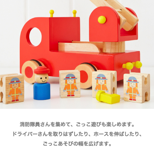 ドライバーさんを取りはずしたり、ホースを伸ばしたり、ごっこあそびの幅を広げます。