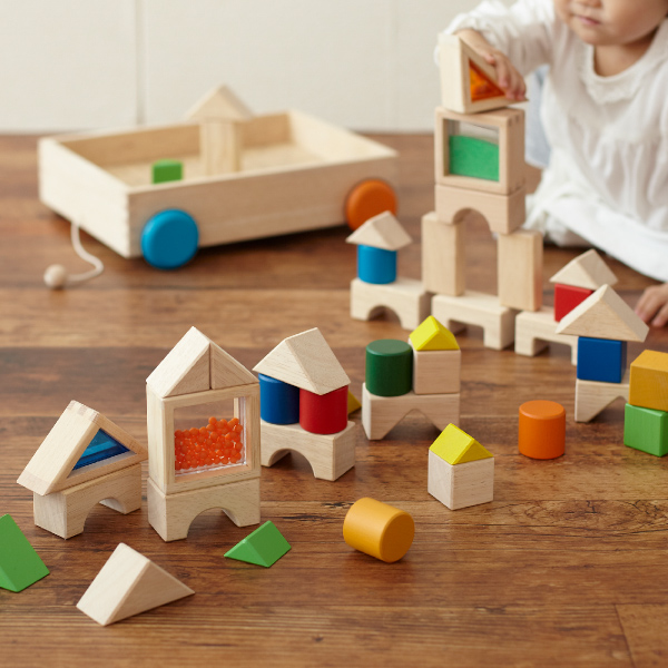 丸や三角・四角などたくさんの形や大きさの13種類41ピースのつみきセットです。天然の白木つみきと、振るとしゃかしゃか音がなる砂やビーズ、アクリルなどの素材のブロックも入ってるので、色や形・音や素材の違いを遊びながら感じることができます。また並べたり、積み重ねたり、くずしたりとつみきあそびを繰り返す中で集中力や全体のバランス感覚も身につきます。つみきを収納できる台車は、ヒモを引いて遊ぶこともできます。