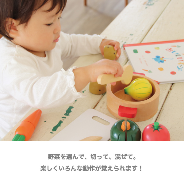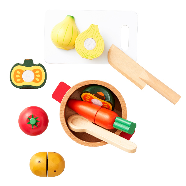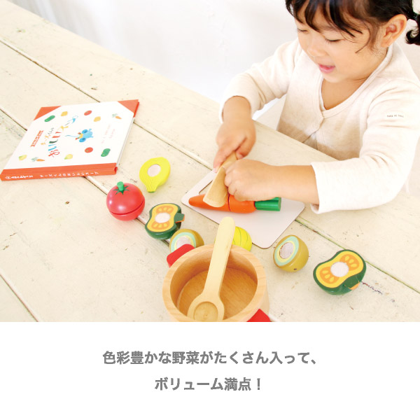 | 絵本 (サイズ:W18.5×H18.5、ページ数:20)、かぼちゃ・じゃがいも・たまねぎ・にんじん・トマト・おたま・包丁・まな板・おなべ ×各1 |