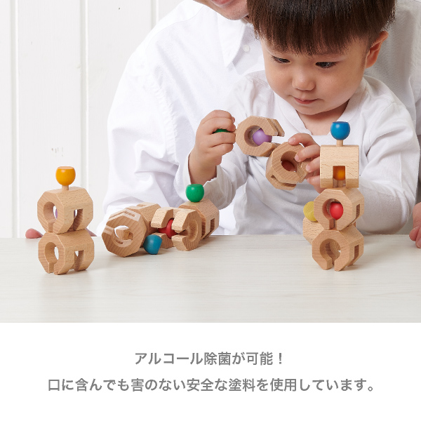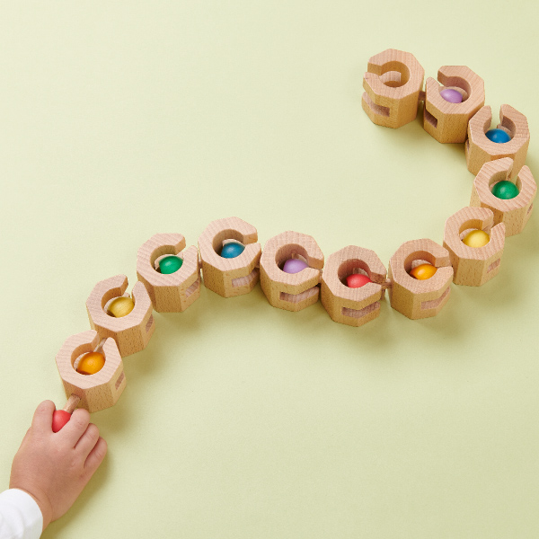 球をスリットに差し込んでつないだら、クネクネ動かしたり、キャタピラのように回転させたり、自由自在!遊ぶ度に新しい積み上げ方・つなぎ方・動かし方の発見があり、遊びの世界がどんどん広がります。