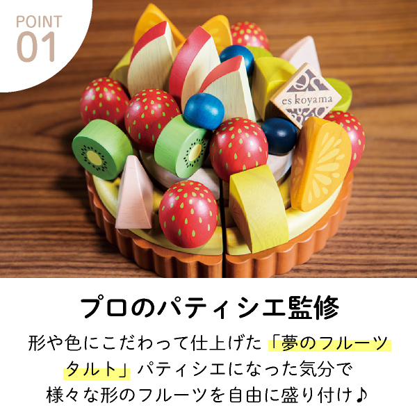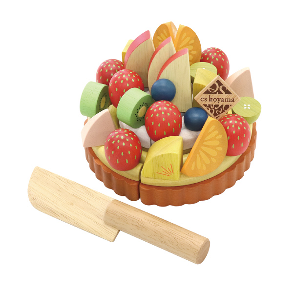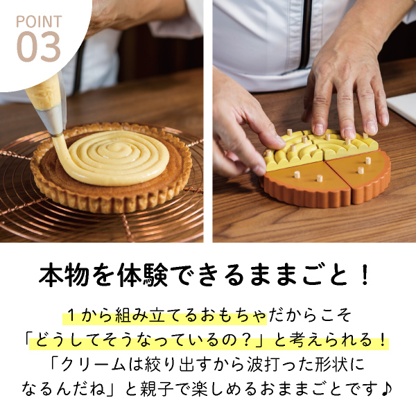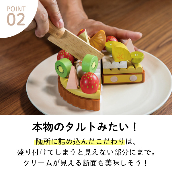 細部までリアルに再現したパーツを組み合わせる工程は、実際にフルーツタルトを作る工程と同じで、パティシエになった気分を味わえます。たっぷりのフルーツを盛り付けながら、空間認識力や色彩感覚などの感性を育みます。完成したフルーツタルトを包丁でザクッと切り分ける、おままごとならではの遊びも楽しめます。