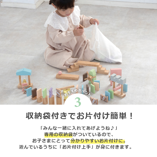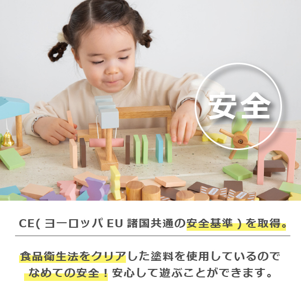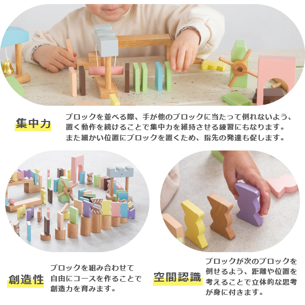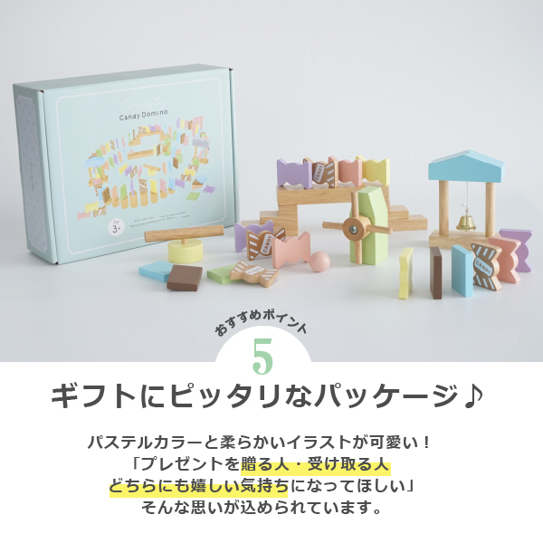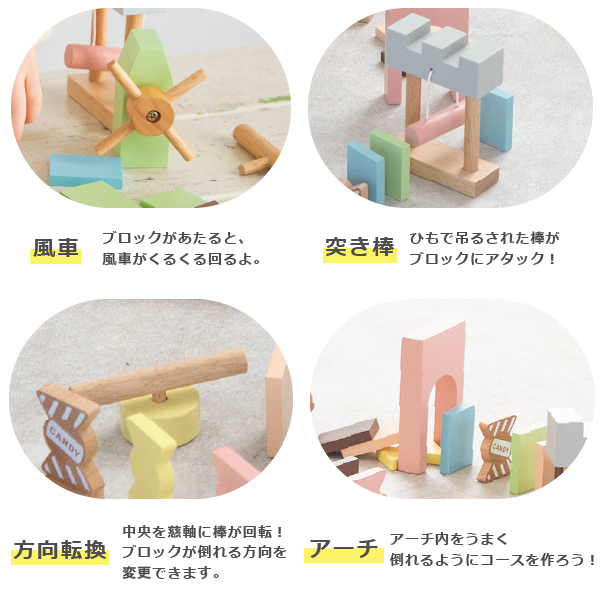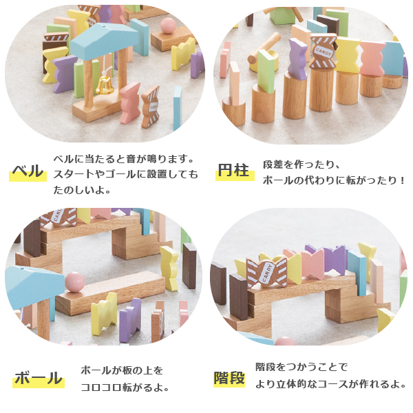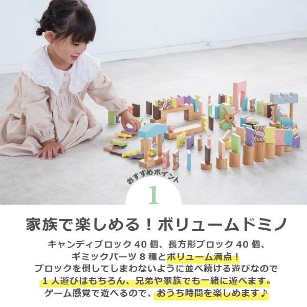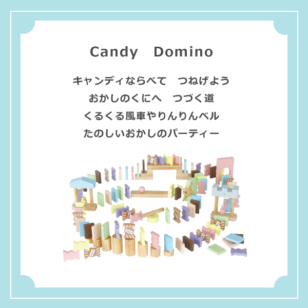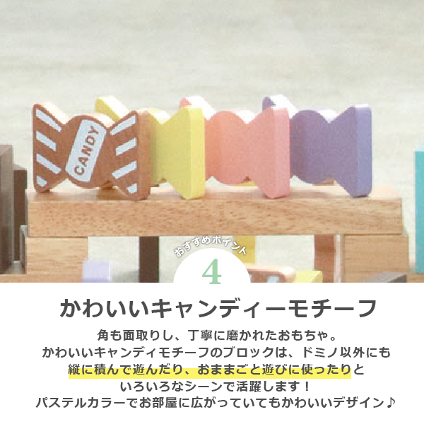 キャンディモチーフのブロックは、ドミノあそび以外にも縦に積むバランスあそびやおままごとなど幅広いあそびに大活躍!