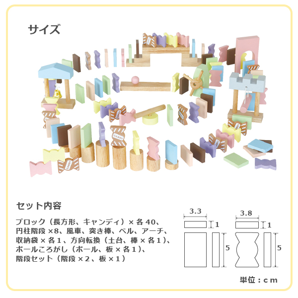 | ブロック(長方形・キャンディ)×各40、円柱階段×8、風車・突き棒・ベル・アーチ・収納袋×各1、方向転換(土台・棒×各1)、ボールころがし(ボール・板×各1)、階段セット(階段×2、板×1) |