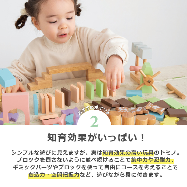 ドミノブロック80個とギミックパーツ8種類とたっぷり遊べるセット。ブロックやパーツを並べ、風車や突き棒などのギミックパーツを上手に盛り込めばコースにさまざまな変化をつけられます。