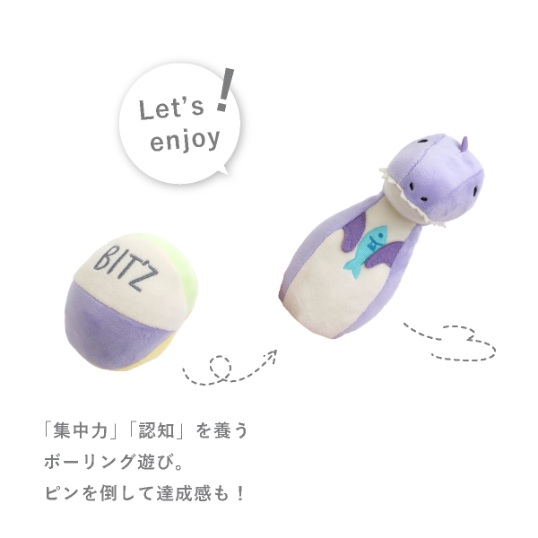 「よーくねらってボールを投げる→ピンにあたる→ピンが倒れる」という経験の中で「集中力」や「認知」を養います。ボールには『カラカラ♪』鳴るものが入っているので、ピンにぶつけた時の達成感も促せます。5種類のカラフルな恐竜のピンはお人形としても遊ぶことができます!親子やお友達とのふれあいを深めながら「コミュニケーション能力」も楽しく育めます。