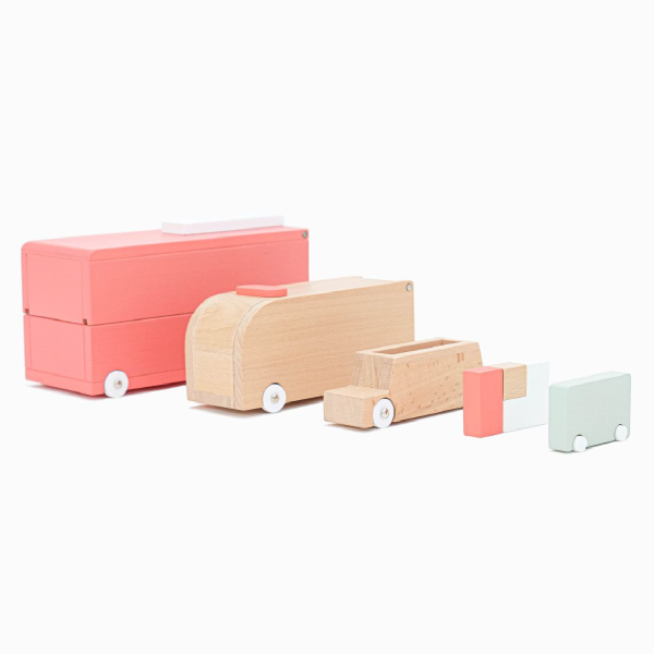 マトリョーシカのように中からくるまが次から次へとそれぞれちがう登場をします。消防車、救急車、バス、積み木を入れ替えるとタクシー、パトカーにも。