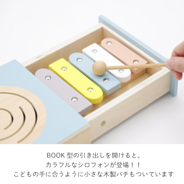 BOOK型の引き出しを開けると、カラフルなシロフォンが登場!!こどもの手に合うように小さな木製バチもついています。