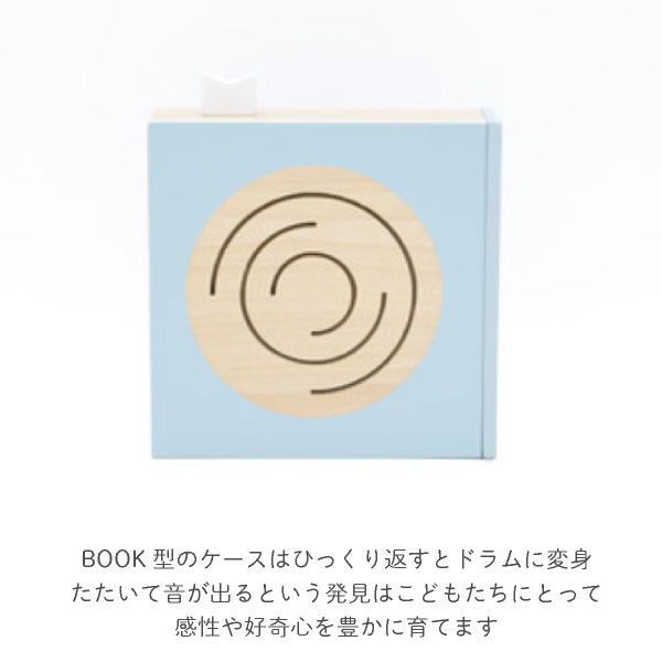 BOOK型のケースはひっくり返すとドラムに変身。たたいて音が出でるという発見はこどもたちにとって感性や好奇心を豊かに育てます。