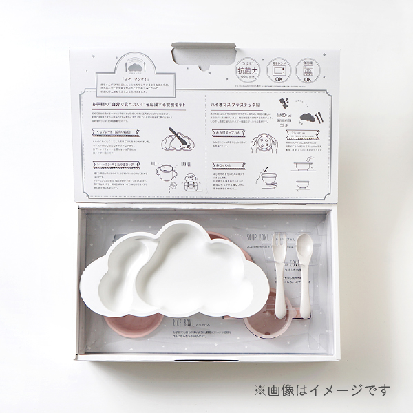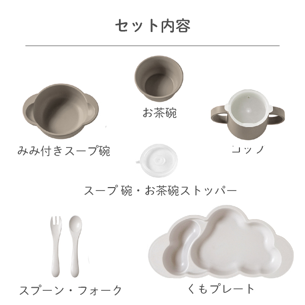 | くもプレートgrande×1 みみ付きスープ碗×1 お茶碗×1 コップ×1 スープ碗・お茶碗ストッパー×1 フォーク×1 スプーン×1 |