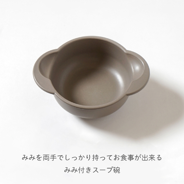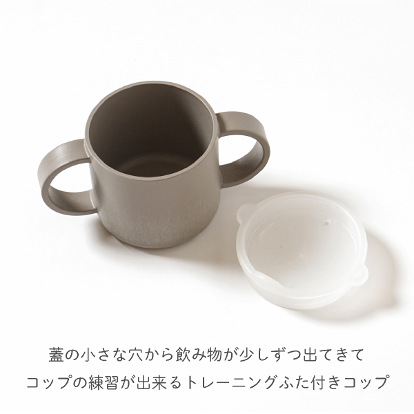 また、コップにはふたが付いており、小さな穴から少しずつ出るので、トレーニングコップとしても使っていただくことができ、スープ碗も、軽く両手でしっかり持つことができるので、初めての「できた!」を応援する食器セットになっています。