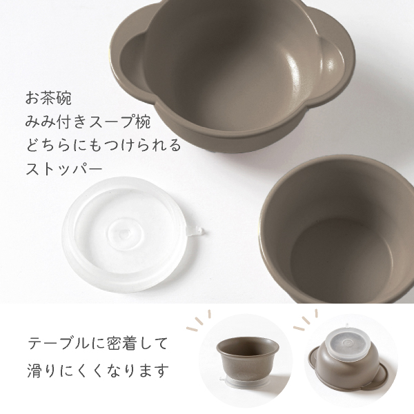 そして嬉しいストッパー付!滑り止めとして、お茶碗やスープ碗に付けることができ、しっかりとテーブルに密着してくれることにより、ひっくり返す心配も少なくなります。