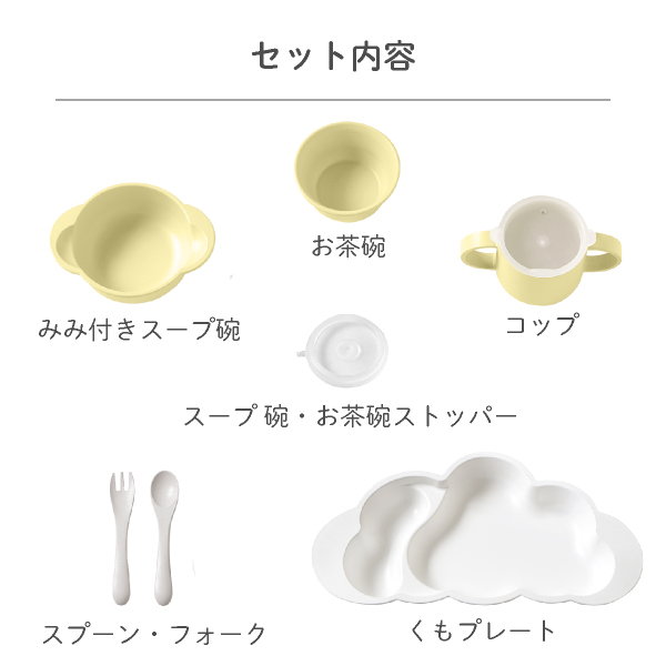 | くもプレートgrande×1 みみ付きスープ碗×1 お茶碗×1 コップ×1 スープ碗・お茶碗ストッパー×1 フォーク×1 スプーン×1 |