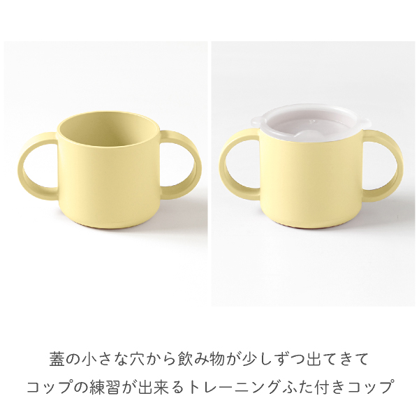 また、コップにはふたが付いており、小さな穴から飲み物が少しずつ出る構造になっており、初めてのコップ練習としても使っていただけます。