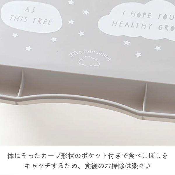 そんな便利なプレートにシリコンマットがセットになりました。シリコンがテーブルに密着してくれるので、滑り止めの役割もしてくれ、体に沿ったカーブが食べこぼしをキャッチし、縁付なので液体もこぼれるのを防いでくれます。