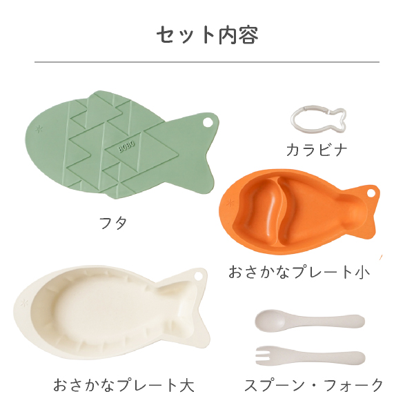 | おさかなプレート大×1 おさかなプレート小×1 フタ×1 カラビナ×1 フォーク×1 スプーン×1 |