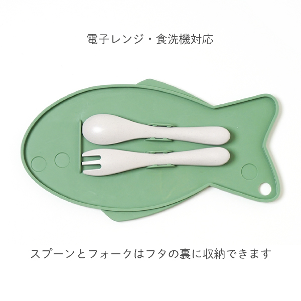 プレートが2枚と、カトラリーが付いた持ち運びに便利なおさかなセット。