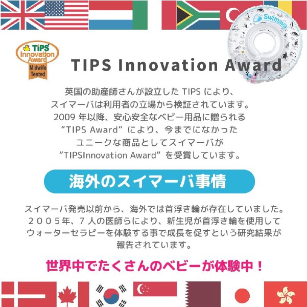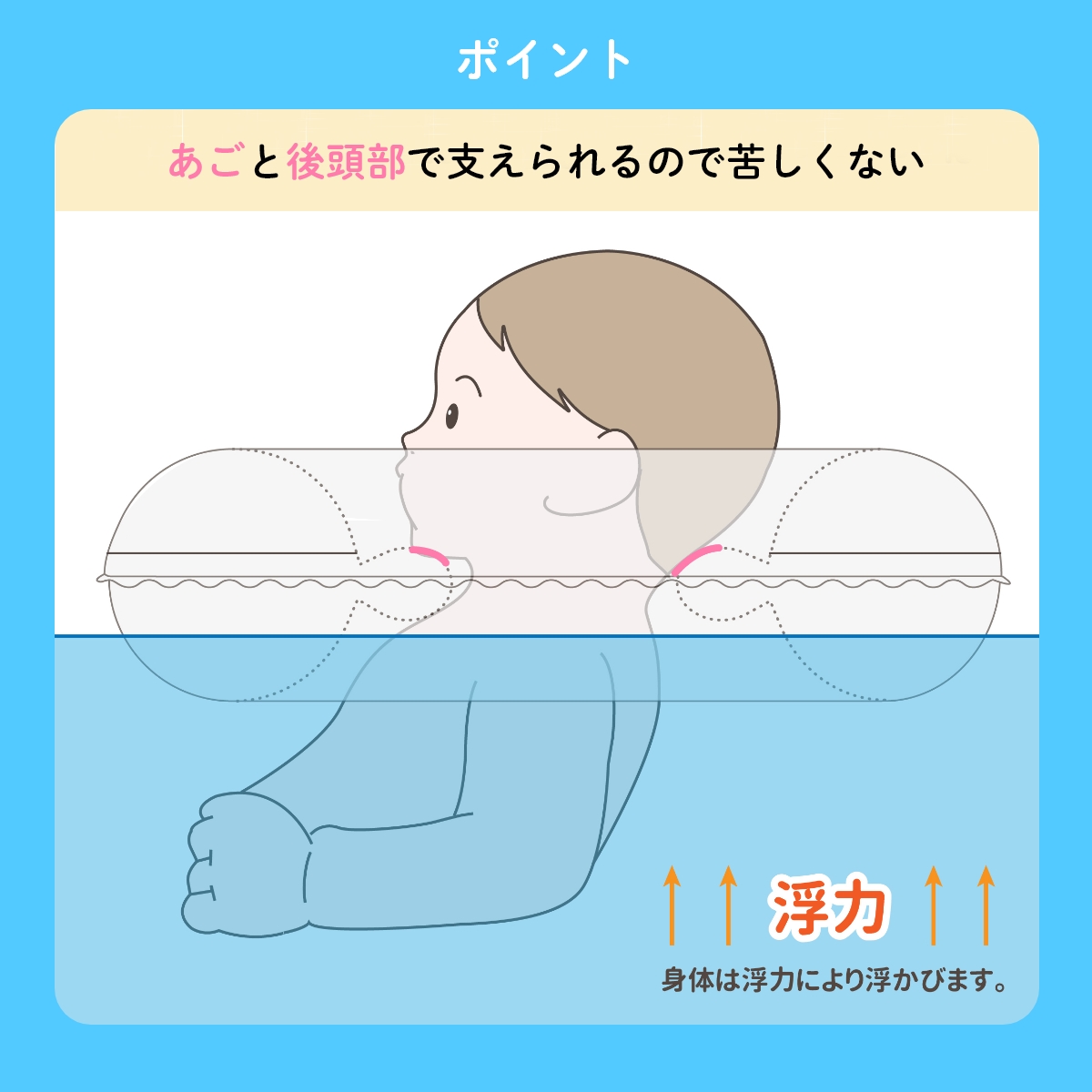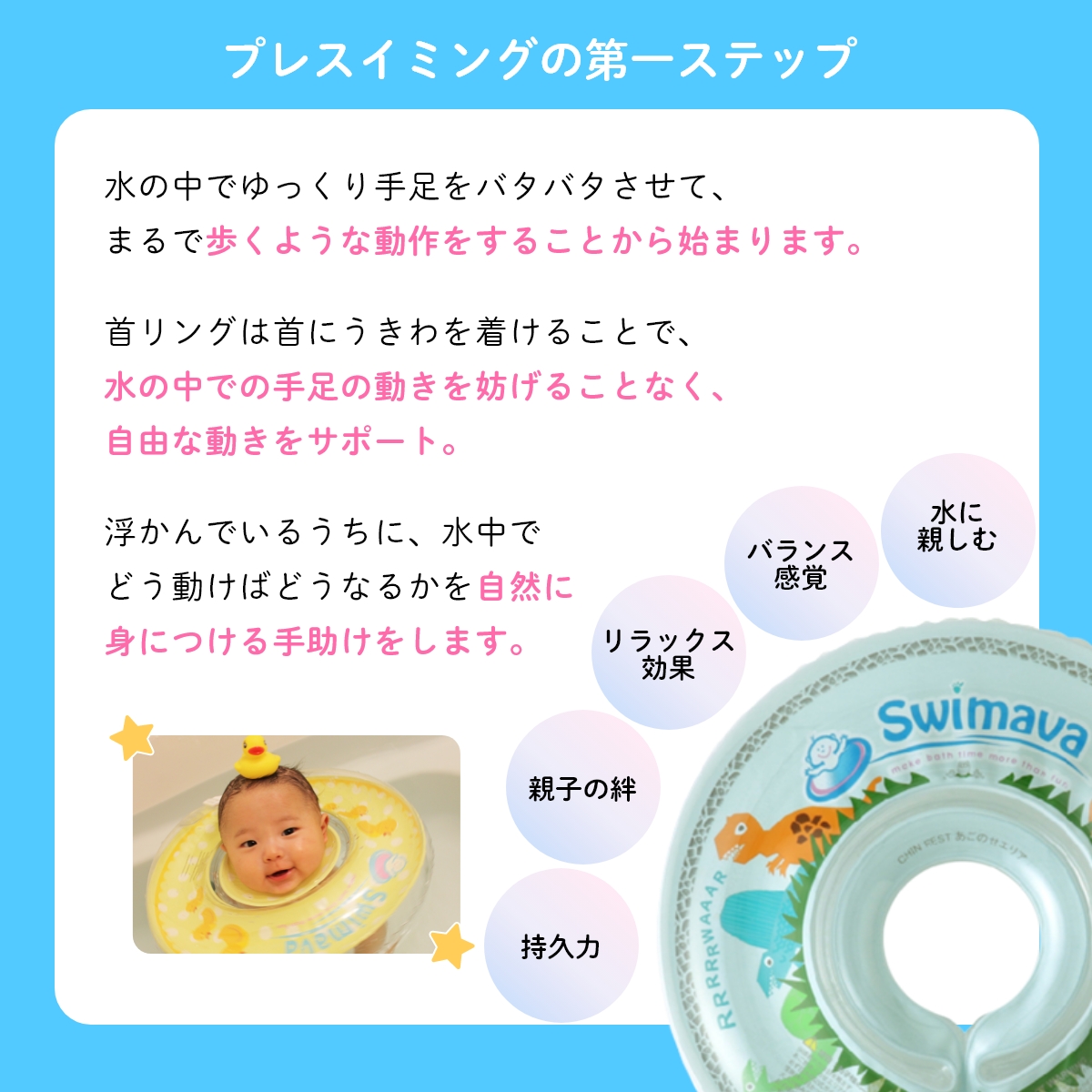 首リングは赤ちゃんが生まれて初めてエクササイズすることを目的に開発された、うきわ型スポーツ知育用具。首にうきわを付けることで、水の中での手足の動きを妨げることなく、自由な動きをサポート。赤ちゃんがぷかぷかスイスイ泳ぐ姿はとっても可愛らしく、さまざまな効果も期待されます。