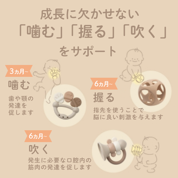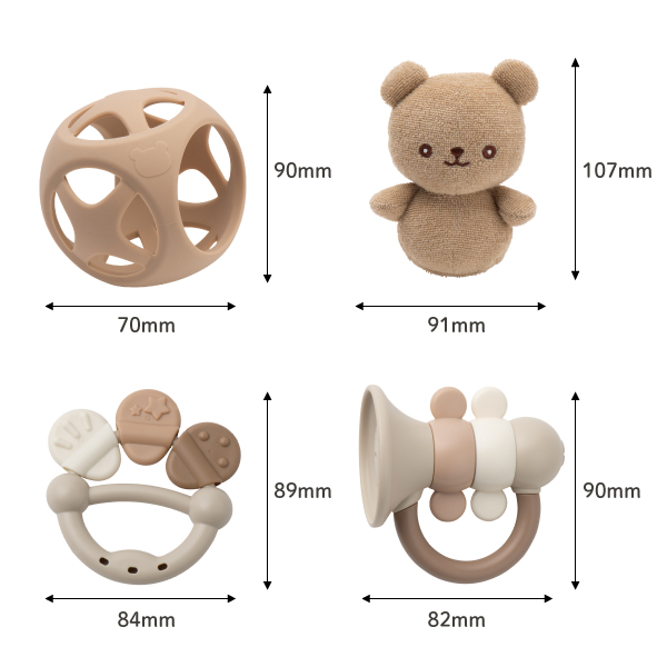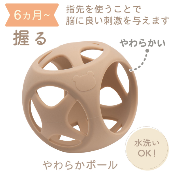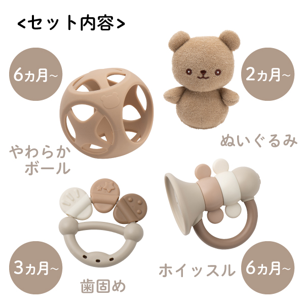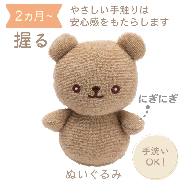 ころんと可愛いくまのぬいぐるみは柔らか素材で、生後間もない時から遊ぶことができます。成長にあわせて、歯固めやボールなどお子さまの発達を促してくれる知育おもちゃばかり!すべて水洗いできるアイテムなので、清潔に使用することができます。