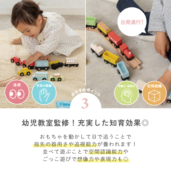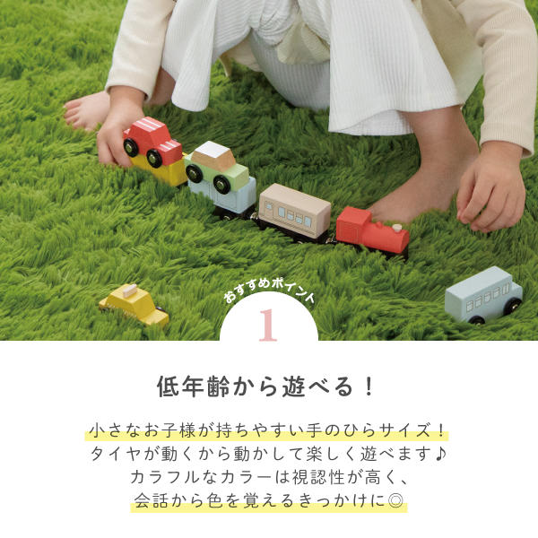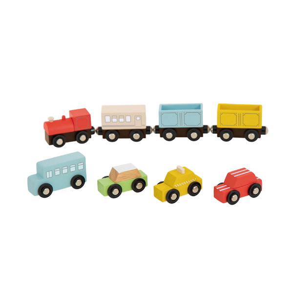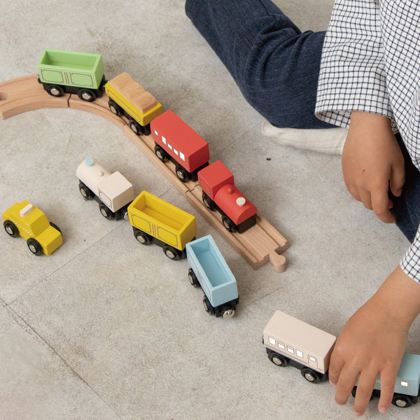 木のぬくもりを感じる列車と車のセット。