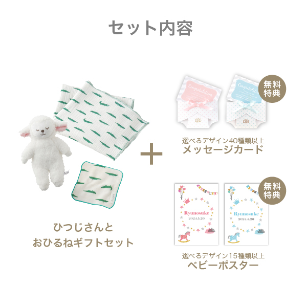 ふわふわ素材のひつじのぬいぐるみが、赤ちゃんのおひるねをそっと見守ります。毎日使える実用性と遊び心がつまった、出産祝いにぴったりのギフトです。
