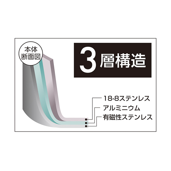 熟練の技巧、信頼の日本製。鍋の本体は、熱伝導性に優れたアルミニウムを耐久性と保温性に優れたステンレス鋼でサンドした3層構造(3LAYERS)。IHはもちろん、ガス火やオーブン調理、アウトドアでの焚火や炭火にも対応します。