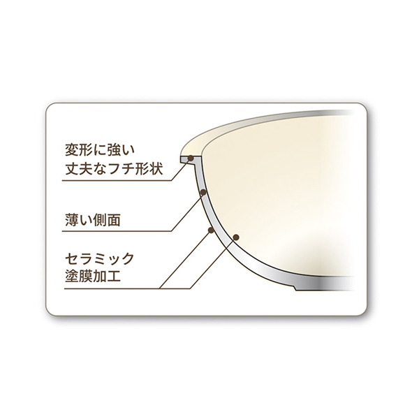 耐久性に優れ、お手入れ簡単なセラミックコーティング。側面を薄くすることで軽量化し、底面はしっかり厚くすることで変形しにくく、熱が均一に伝わります。内面にハンドルを止めるビスがないので、お手入れも楽々。PFAS・PFOA不使用のセラミック加工で環境にやさしく、安心してご使用いただけます。