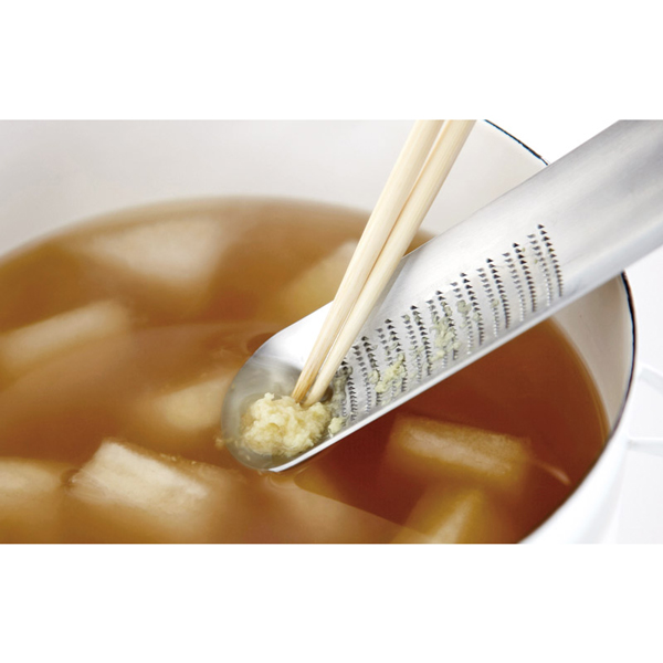 トレーのようなモダンデザインなので、そのままテーブルに出しても素敵です。ワサビやしょうがなどの薬味を卓上ですりおろし、新鮮なまま料理に添えることができます。周囲にカーブをつけたトレー形状でこぼれにくく、汁物などには薬味を溶かしながら入れることができます。