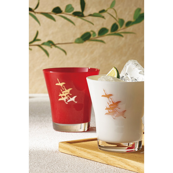 紀州漆器×ガラス。紅白のおめでたい「ぬり色」に縁起の良い千羽鶴をあしらいました。口が広くなっていて飲みやすい形。縁起の良さから長寿のお祝いや贈り物、記念品にぴったりなアイテムです。