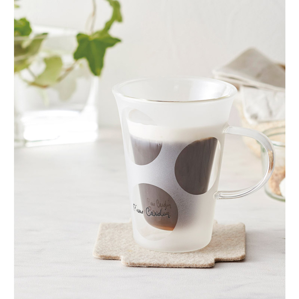 2重構造で保温・保冷効果が抜群です。コーヒーや紅茶、ジュースなど、ご自宅でティータイムを楽しむのにぴったり。外面にはブラストで表現した大きな水玉模様が入っていてキュート!電子レンジも使えて便利なガラスマグカップです。カルダン氏のサイン文字が入っています。