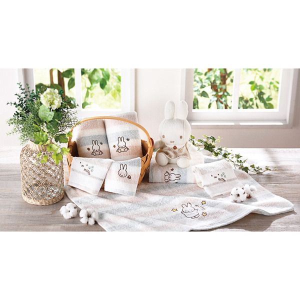 パイル糸にインドで栽培したオーガニックコットンを使用した環境にも優しいタオルです。ミッフィー のかわいいシルエットとナチュラルなボーダー柄のタオルギフトシリーズは、子どもから大人まで幅広く使っていただけます。
