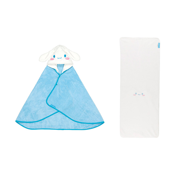 マイクロファイバー素材でやさしい肌触りと高い吸水性を実現。ヘアドライタオルとフード付きバスポンチョのセットでお風呂上がりも快適。シナモロールの可愛らしいデザインが赤ちゃんのバスタイムを楽しく彩り、贈り物にぴったりのギフトです。