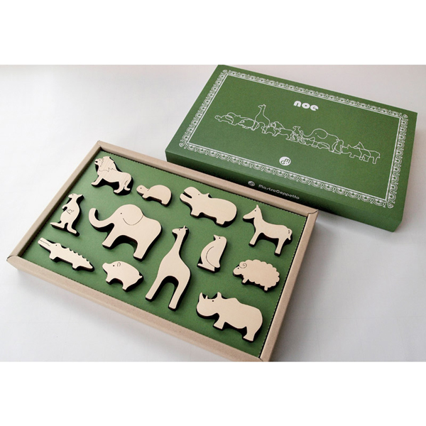 「ノアの方舟」からイメージして生まれた、木の動物セットです。物語を作ってトコトコ歩かせたり、積み木や乗り物おもちゃと組み合わせたり、またインテリアとして長く遊べるおもちゃです。バスタイムにプカプカ浮かせて遊ぶと木の香りも楽しんでもらえます。
