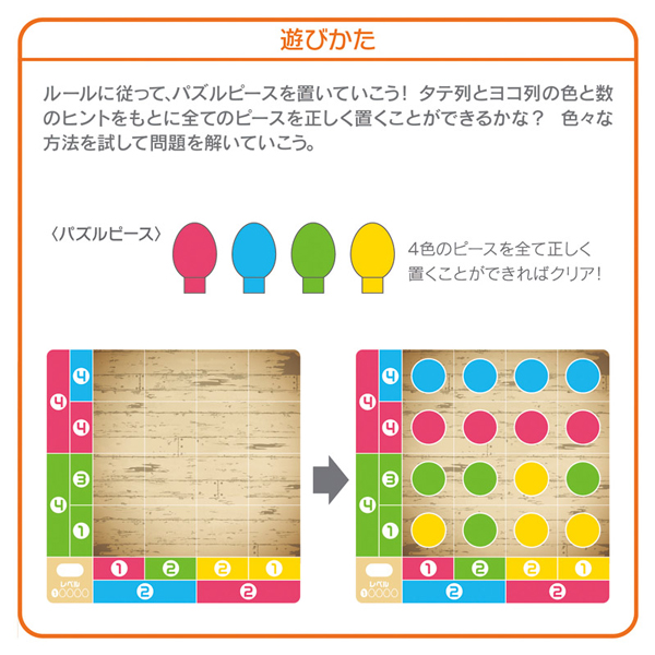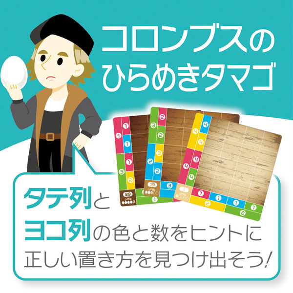 問題カードのタテ列とヨコ列の数と色のヒントをもとに、16個のピースを正しい場所に配置するパズルゲームです。誰でもできそうなものでも最初に行うのは難しいというコロンブスのタマゴの逸話をモチーフにしています。