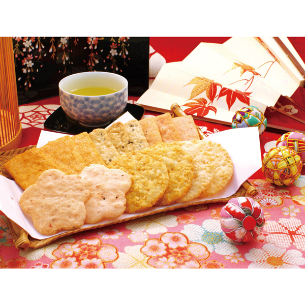 | 金澤カレー煎餅・えびまめ花煎餅・海老胡椒煎餅×各8、黒ごま入り玄米煎餅・海老カレー煎餅×各5、つぶやきサラダ煎餅×4 |