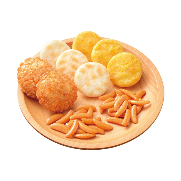 | 亀田の柿の種(5g/個装)・梅しそ柿の種(5g/個装)・しおせんべい(1枚)・カレーせんべい(1枚)・あげせんべい(1枚)×各18 |