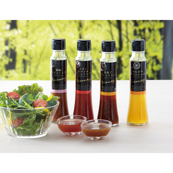 | しょうがドレッシング(100ml)・胡麻ドレッシング(100ml)・とまと&バジルドレッシング(100ml)×各1 |