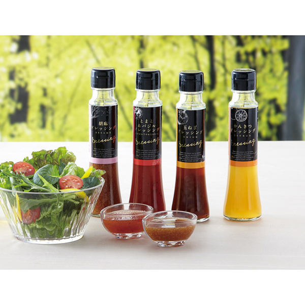 | しょうがドレッシング(100ml)・胡麻ドレッシング(100ml)・とまと&バジルドレッシング(100ml)・玉ねぎドレッシング(100ml)・ひまわり油(90g)×各1 |