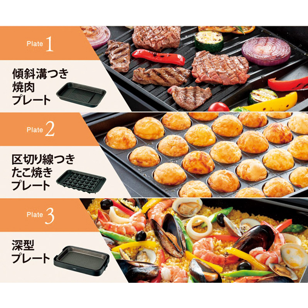「傾斜溝つき焼肉プレート」「深型プレート」「区切り線つきたこ焼きプレート」の3枚プレートがついています。定番料理はもちろんパエリアなどのこぼれやすい料理なども楽しめて料理の幅が広がります。