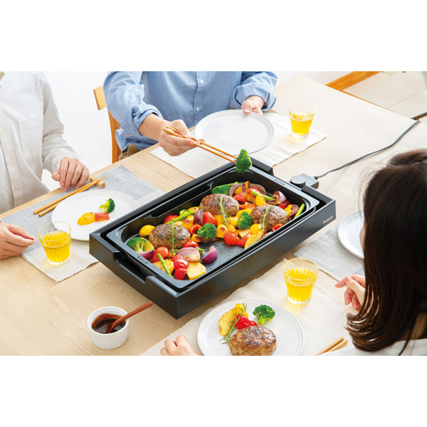 蒸す・焼くの2通りの調理ができるスチームポケット付きホットプレート。具材をたっぷり入れてもこぼれにくい4cmの深型プレートで、お好み焼きが2枚焼けるワイドサイズです。プレートは丸洗いできるので、お手入れも簡単です。