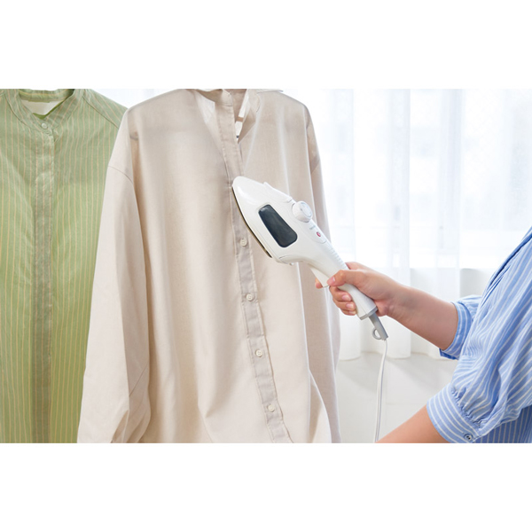 外出前の身支度をぐっとラクにするハンガースチーマー。衣類をハンガーにかけたまま手早くシワをリセットでき、さらにアイロン機能でパンツのプレスも簡単に仕上がります。忙しい朝にも便利なアイテムです。