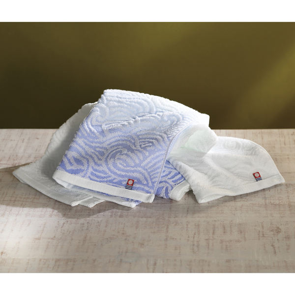 透き通るような青のグラデーションと白のコントラスト、打ち寄せる白波のように織られた波の模様が印象的。綿の柔らかさを生かしつつ、軽くさっぱりとした肌触りに織り上げられています。