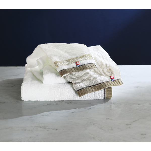 高級感のあるグレーとあたたかみのあるベージュを混ぜ合わせた、グレージュカラーのタオルセット。甘撚りの糸で織り上げ、ふんわりとした肌触りです。長い歴史の中で培われた今治のジャガード織で、ゆったりとしたオーナメント柄を繊細な曲線美で表現。優しいグラデーションにも、糸染めの業が光ります。