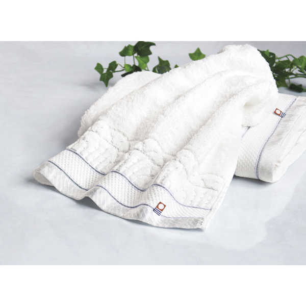 やわらかな甘撚り糸を使用することで、思わずほおずりしたくなる質感とボリュームに仕上げました。連なるアーチにさりげなく織り込んだ光沢糸や、繊細かつ格調高い印象を与える銀糸と藤色のライン。肌触りだけでなく、見た目にも豪華さを感じていただけるこだわりが光ります。白く輝き、ふんわりと包み込む、今治の美しく心地良いタオルをお届けします。