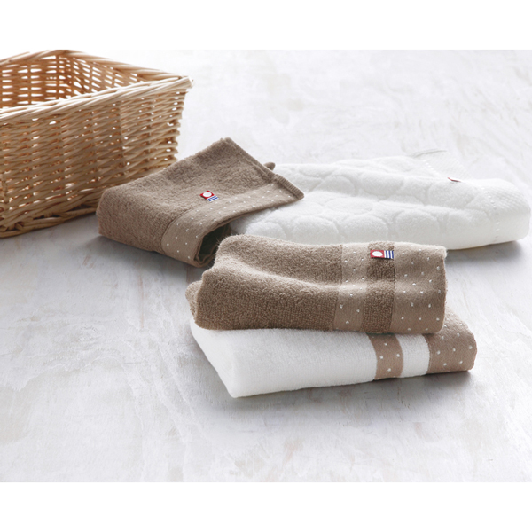 チョコレートや焼き菓子を思わせるブラウン・ベージュのナチュラルカラー。どこか懐かしく飽きることのない小さなドット模様。どなたに贈っても喜んでいただけるナチュラルカラーの今治タオルです。