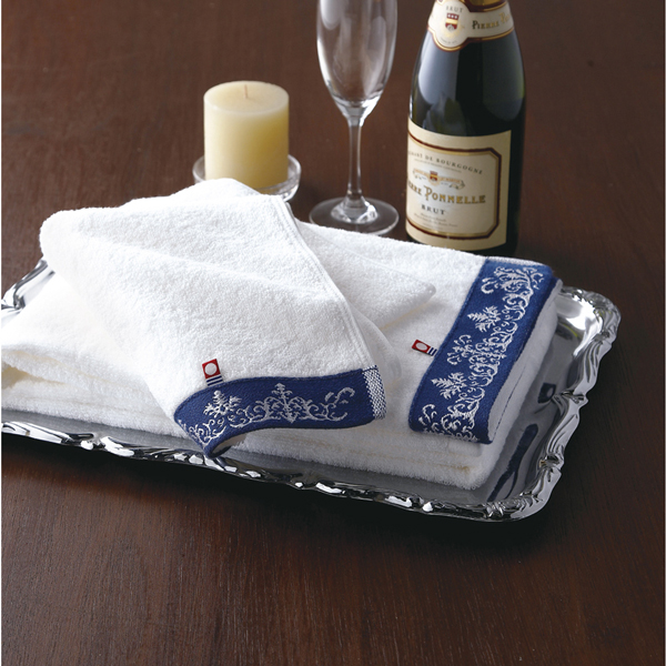 ホワイトでしっかりとした手触りのタオルで、オーナメントの柄をヘムにあしらったオシャレなタオル。シンプルだけどトラッドなデザインのホテル仕様の上質でやわらかい肌ざわりの今治タオルギフトです。
