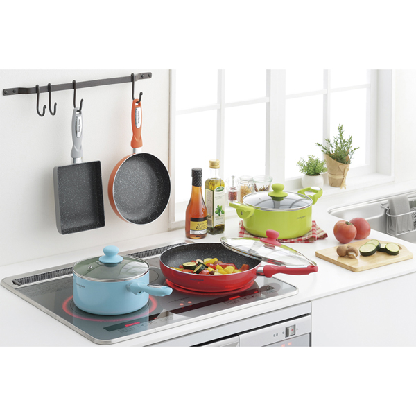 「マリ・クレール カラーズ」は、内面マーブルフッ素樹脂加工でお手入れ簡単なアルミ製調理器具。軽量で調理の負担が少なく、ハンドルはシリコン塗装で滑りにくく手に馴染みます。日常使いやギフトに最適な使いやすいアイテムです。